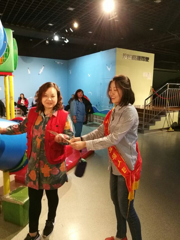 防灾减灾周期间,威海市地震局的科普志愿者来到市科技馆,向市民分发科普资料,宣传防震减灾知识。