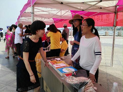 威海广播《直通社区》公益行动暨怡园街道“爱洒怡园”——“公益大篷车”公益集市活动6月23日上午在高区金海滩海水浴场举行,威海市地震局的爱心大使到现场参加了当天的公益行义卖活动。